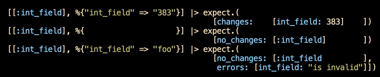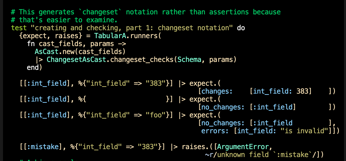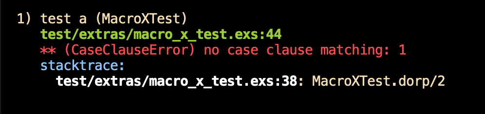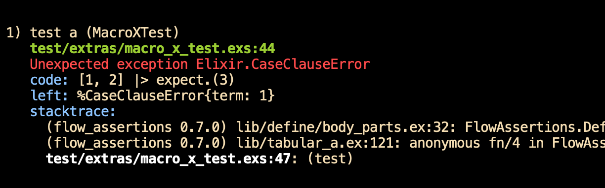 expectfunctions will compare with equality. Why writeassert actual == expectedorassert_equal(actual, expected)if you don't have to? We can make it the default. - ExUnit has nice reporting for failed assertions – I prefer it to what you get for other exceptions. The ordinary report:
